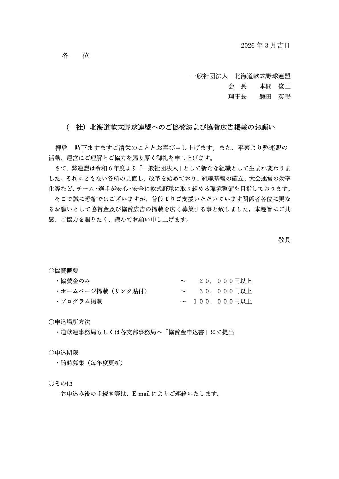 (一社)北海道軟式野球連盟へのご協賛および協賛広告掲載のお願い 2026 3/13 お知らせ 2026-03-13 協賛金申込書をダウンロード お知らせ よかったらシェアしてね! URLをコピーしました! URLをコピーしました! 道軟連会報88号(2025年度後期号)及び番付表(令和7年)を掲載しました。 関連記事 道軟連会報88号(2025年度後期号)及び番付表(令和7年)を掲載しました。 2026-03-13 ホームページリニューアルのお知らせ 2026-02-09